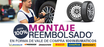 Del 16.09 al 13.10.2024 | El montaje deberá realizarse antes del 03/11/2024 inclusive. Envíenos la copia de la factura del montaje, a su nombre y que corresponda a los neumáticos comprados en 1001neumaticos.com, deberá llegarnos dentro de los 10 días posteriores a la realización del servicio. El reembolso del montaje se realizará en forma de un vale de compra (código promocional), válido en 1001neumaticos.com.
